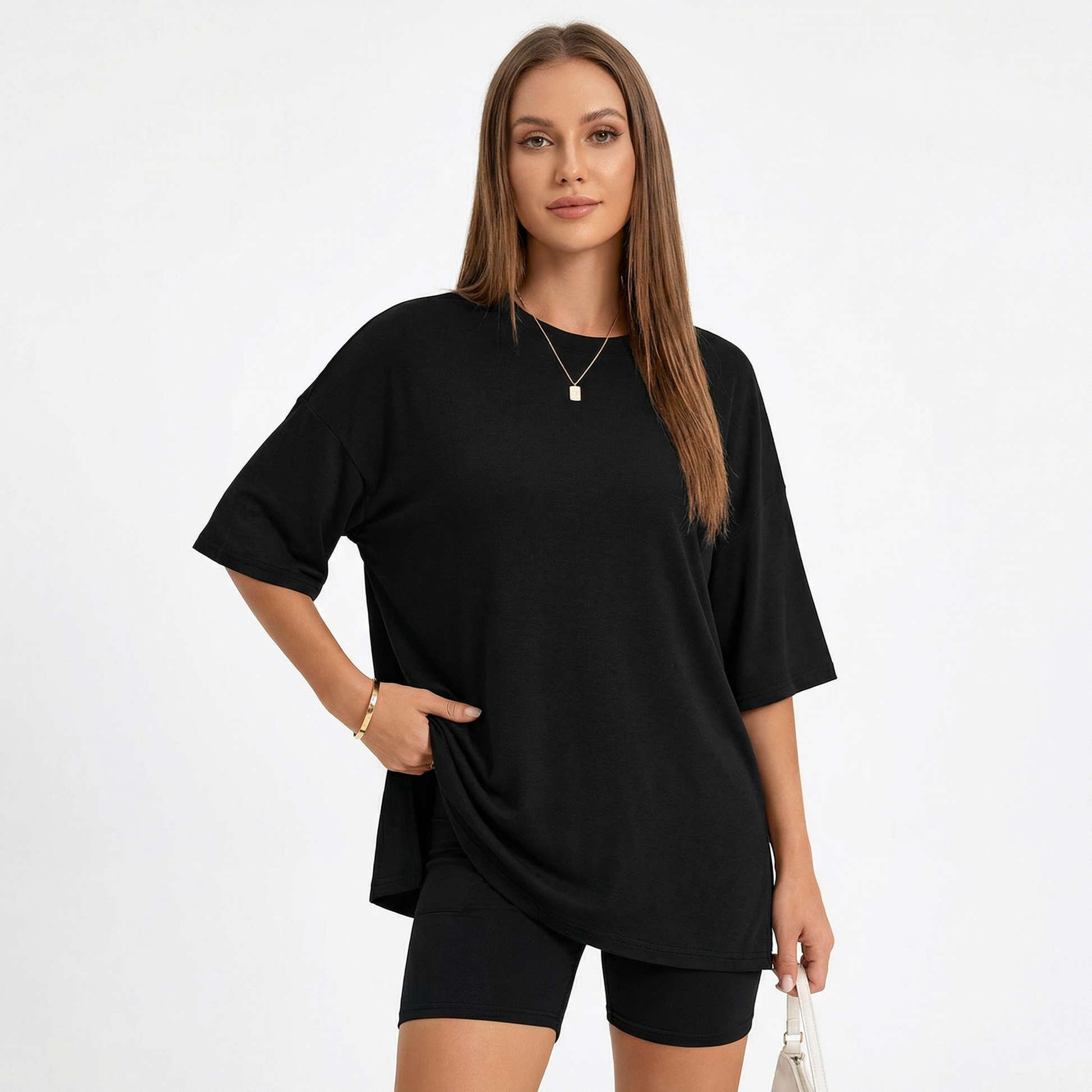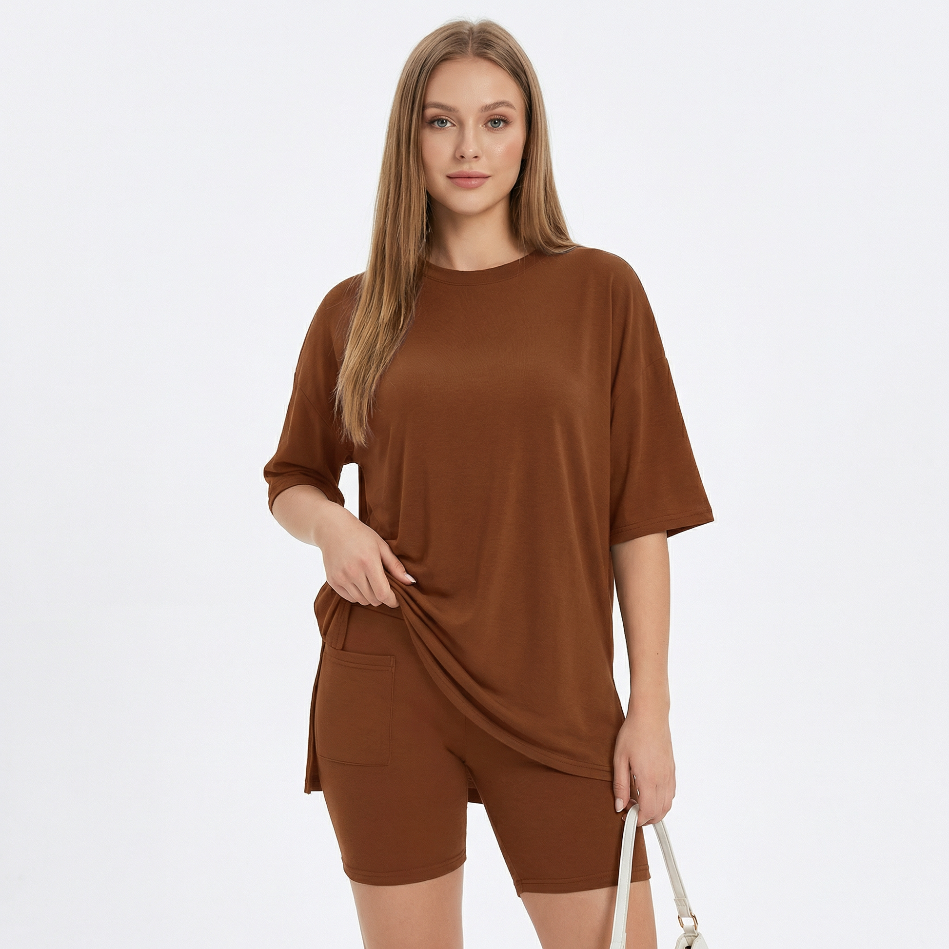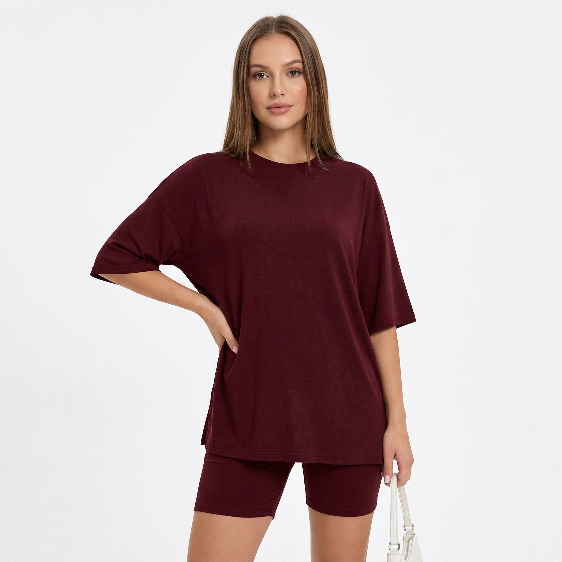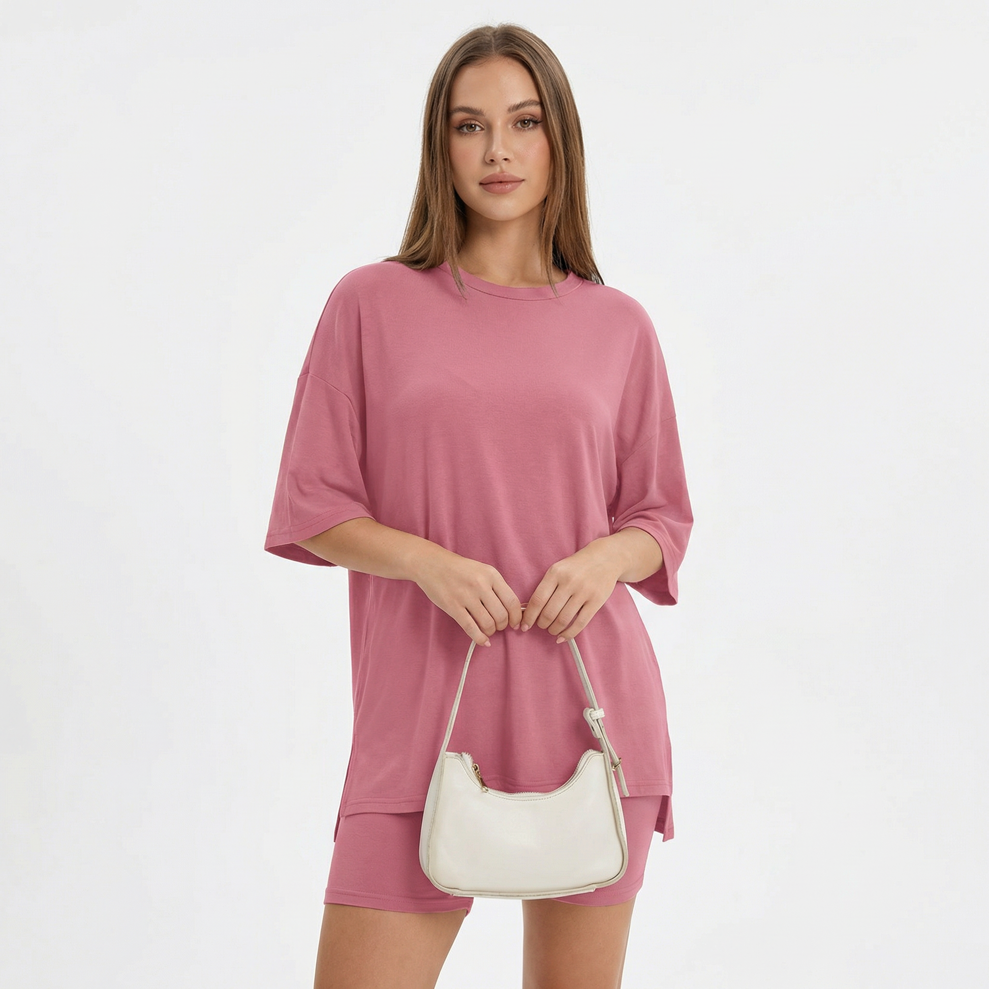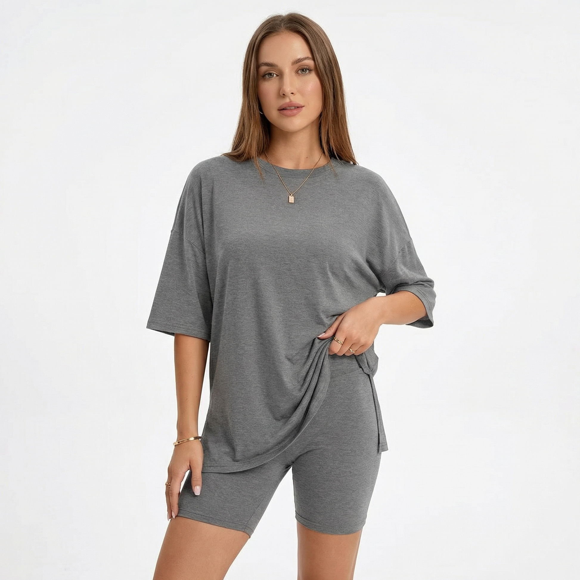 The Moomly Set is designed to move with your body, not against it. Ultra soft oversized tee paired with high-waisted bike shorts for all-day comfort that actually looks good. From the couch to the coffee run — one set, zero effort.