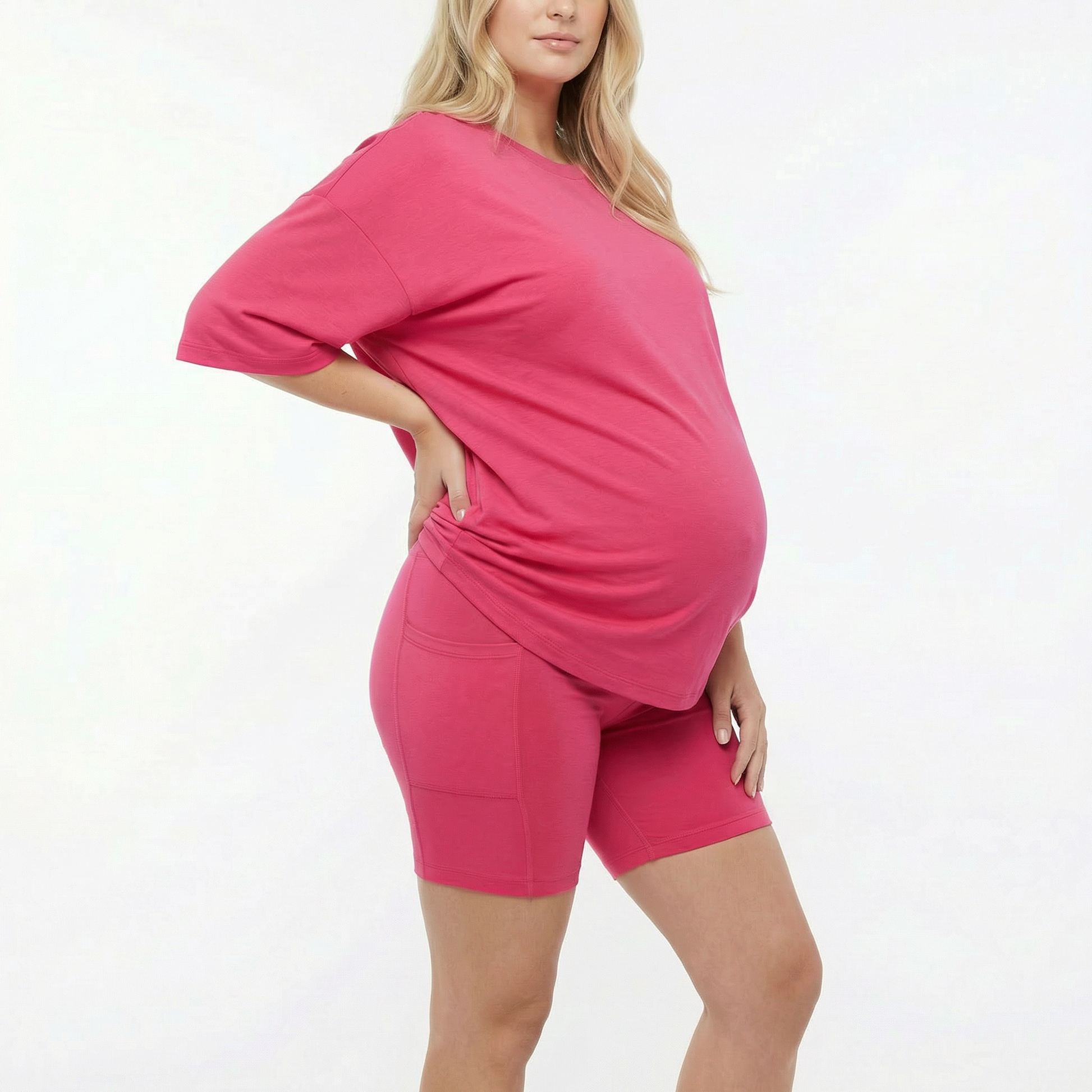 Relaxed oversized fit — if you're between sizes, go with your usual size. The stretchy waistband adapts to your body comfortably. Model is 5'6" wearing size L at 32 weeks pregnant.